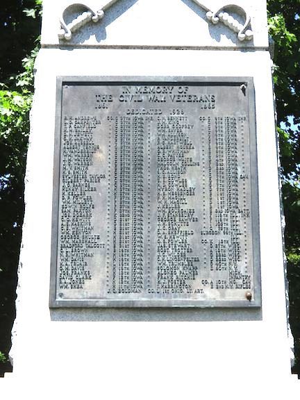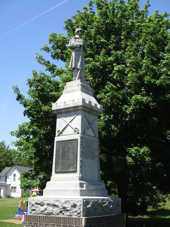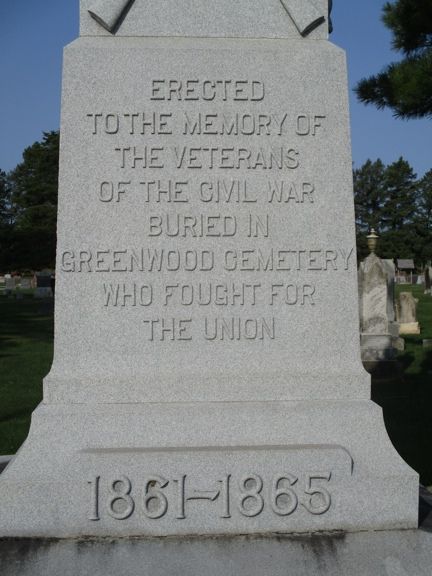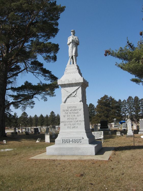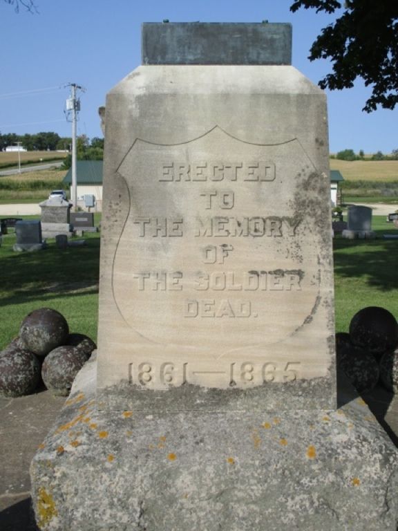 This is a 25 foot monument with a base of stone blocks. There are marble plaques on four sides that are somewhat difficult to read. The one on the north side is shown with 19 soldiers listed and inscription "1861 1865 In Memoriam To the Dead Buried in Unknown Graves." The east panel "Grand Army of Republic Erected by GAR Post No 63 1897." The south panel lists 25 soldiers. The west panel "Dedicated to the Citizen Soldiers and Sailors who Enlisted from Hazelton Township and Fought in the War of the Rebellion 1861 to 1865." 9 soldiers are listed on this panel. It is south of town off highway 150. Take 125th Street west to the cemetery. Photos taken 6/3/21