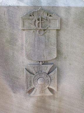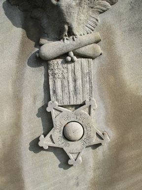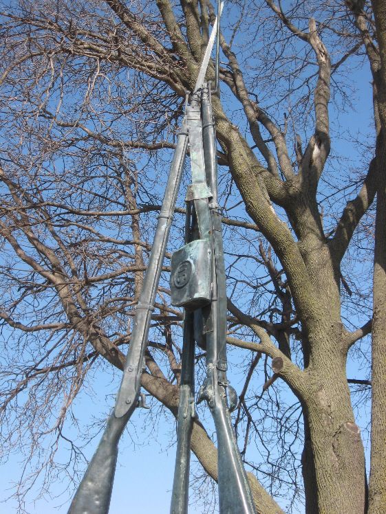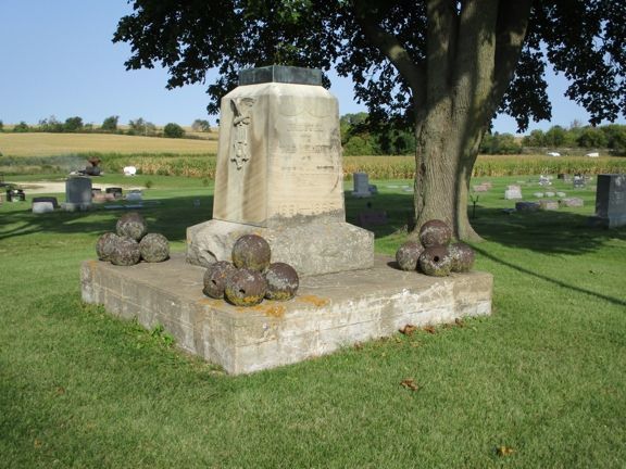 This monument in Fairview Cemetery formerly had 6 foot muskets - also with a belt, canteen, cartridge box, and scabbard. The first photo taken 9/17/20 shows that the stacked arms are missing. The second and third photos taken 3/25/08 includes the stacked arms. These were damaged by a fallen tree branch but hopefully can be repaired and restored to the monument. There are also five mortar shells located on each corner. The cemetery is on the SW side of town off 220th Street.