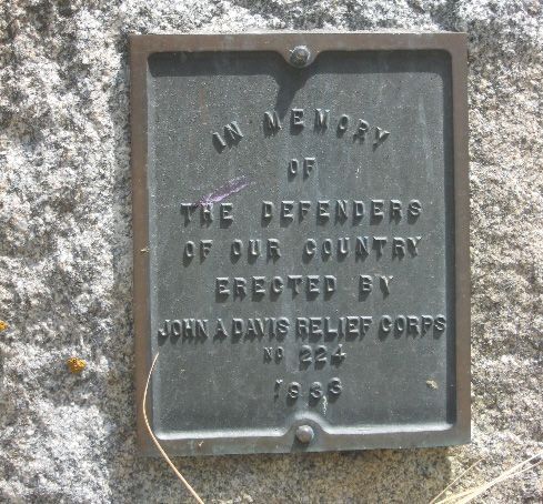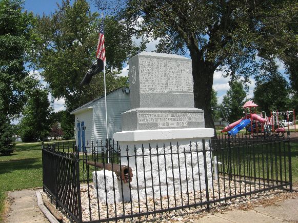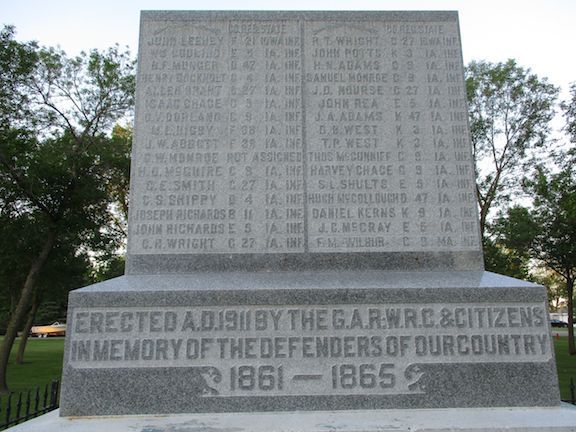 This is a nice monument in Veterans Park in Fairbank. It is granite about 6x6 feet on top of a stone base. Names of 56 soldiers are inscribed on both the north and south sides of the monument. The first photo is from the south - the second photo from the north. Also inscribed is "Erected A.D. 1911 by the GAR, WRC & Citizens in Memory of the Defenders of our Country 1861-1865." There is also a non-CW cannon about 9 feet in length. The park is in the SE part of town - take 5th Street south off Highway 281 to the monument. The first and third photos were taken 7/4/08 - the second photo on 6/3/21.