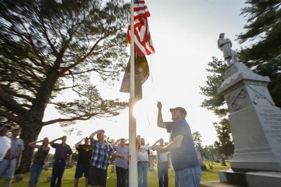 This 21 foot granite monument is in great condition. It was dedicated on Memorial Day, 1916 with many people attending the day long program. The cost of the monument was $1600. There continues to be a service each Memorial Day with the names of Veterans, including 66 CW Veterans, being read. The final photo, from the Cedar Rapids Gazette, shows the ceremony held on the 100th anniversary on Memorial Day, 2016. Thank you to Orlan Love for information about this monument. The cemetery is located on the north edge of town. The first photo was taken 3/25/08 - the second one on 9/17/20.