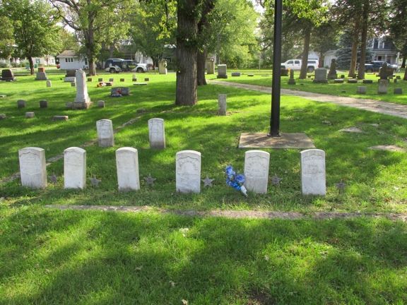 This burial plot is located in Oakwood Cemetery in Independence. While not really a monument, the plot is outlined by stones and has a number of Civil War Veterans buried there, including an unknown soldier. The new flagpole is in the center of the plot. Edmund C. Little was a member of Co. C, 9th Iowa Infantry Regiment. He enlisted as a Corporal and later was promoted to Captain. He was wounded at Vicksburg on May 22, 1863 and was discharged for wounds on February 3, 1864. Some sources show his date of birth as March 11, 1845 - if so, he would have been age 16 at enlistment and a few days short of his 18th birthday when he was promoted to Captain. The GAR Post in Independence was also named in his honor. He died in 1874. Oakwood Cemetery is on the south side of town on Highway 150 or 3rd Ave SE. Thank you to Leanne Harrison for this notification - she reports that a Memorial Day service is held here each year. Photos taken 9/17/20.