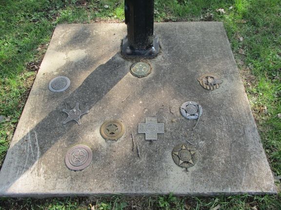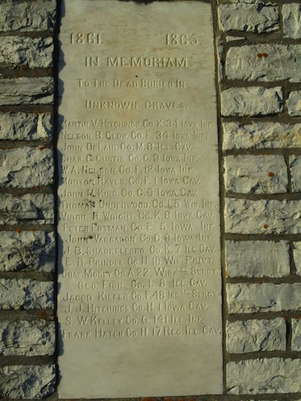 This Civil War plaque is on a small stone in Cedar Crest Cemetery. It is on the east side of town on 2128 Carter Avenue. You will pass a Catholic Cemetery before coming to Cedar Crest. The monument is located by the flagpole. Photos taken 7/4/08.