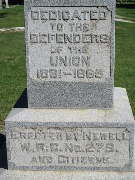 This is a 12 foot obelisk with inscription "Dedicated in memory of unknown dead" on the back of the monument. The inscription on its front is shown below. The nearby cannon is in bad shape - it is inverted and has had a crack repaired and is held together with metal straps. It is a 24 pounder flank howitzer, M1844 cast at the Cyrus Alger & Co. foundry. The cemetery is in the NE part of town. Take Fulton Street through the business district to Jensen and then turn east to the cemetery. The monument and cannon are in the center area of the cemetery. The cannon is about 100 feet SE of the monument. Photos taken 5/4/14.