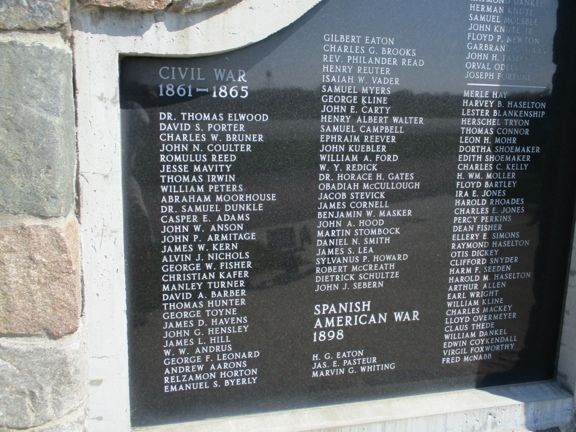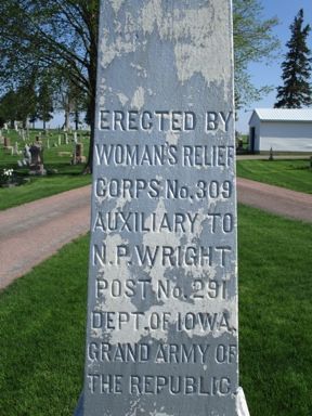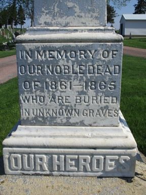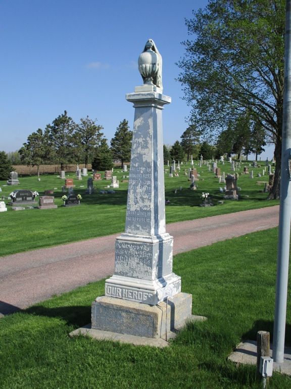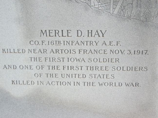 This monument was erected by the WRC. The inscription reads, "In memory of our noble dead of 1861-1865 who are buried in unknown graves." This is located at West Lawn Cemetery (also called Merle Hay Cemetery) in Glidden. Merle Hay, a native of Glidden, was the first Iowan and one of the first three USA soldiers who died in World War I on November 3, 1917 in France. The final two photos are from a monument dedicated to Merle Hay. In 2009 an attractive veterans monument was erected with a section showing Civil War soldiers from the region. The cemetery is located NW of Glidden on Highway 30. The monument is on the west road in the cemetery. Thank you to Steve Hanken for the notification of these monuments. The photo of the veterans monument was taken 5/3/14. The other photos were taken 5/9/18.