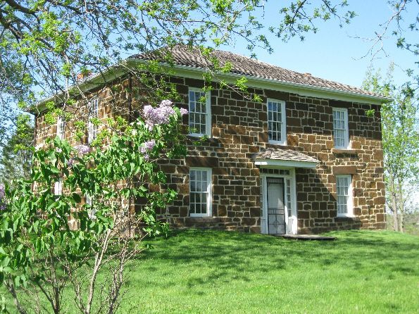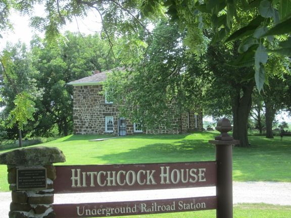 This house was a station on the Underground Railroad. It was built of sandstone from a local quarry in 1856 and is now on the National Register of Historic Places. George Hitchcock was a Congregational minister and active in helping fugitive slaves to freedom. The house is located one mile west and 1/2 mile south of Lewis. It is off Nishna Valley Road which runs west out of Lewis. Call 712 769-2323 for information about tours. Photos taken 5/16/09 and 8/19/14.