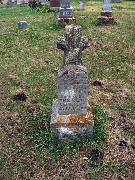 This is an unusual little monument dedicated to soldiers in the Reno Cemetery in Cass County. It is located about 5 miles south of the town of Cumberland. Take County Road N28 - then turn west on G61/Victoria Road to the cemetery. The monument is to the right at the entrance by the old church bell. Thanks to Steve Hanken for the photo and notification of this monument.