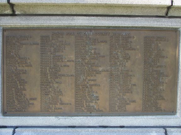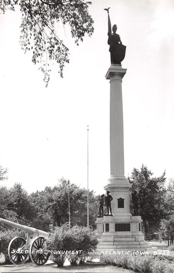 This is an impressive 62 foot monument with four bronze soldiers and sailors and bronze plaques listing Cass County veterans. Lady Liberty sets on top of the monument. The statues represent the infantry, artillery, Navy and WWI. There are bronze plaques on each side of the monument representing soldiers from the area. To commemorate restoration work, there was a re-dedication of the monument on 7/13/13 with a photo of members from the Kinsman and Kirkwood SUVCW Camps in Atlantic and Council Bluffs who conducted the ceremony. The original dedication was July 10, 1919 - the poster from that ceremony is shown. The monument commemorates veterans from the Civil War, Spanish-American War and WWI. There is also a more modern Veterans Monument. The location is in a park south of the business district and off Highway 6. Photos taken 7/13/13, 8/19/14 and 6/29/18. Also shown is an old photo, thanks to David Shedlock, with a cannon (non-Civil War) that is now missing.