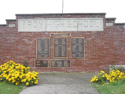 This memorial has plaques honoring veterans from all wars including the Civil War. The brick background appears to be part of the structure of Troy High School which no longer exists. Troy is a small town east of Bloomfield on county road J40. The memorial is in the town park just south of the only intersection. The first photo was taken 10/13/07 - the second one 9/25/18.