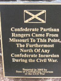 On October 12, 1864, a band of Confederate guerillas or bushwhackers, dressed in Federal uniforms, crossed into Iowa and engaged in murder and robbery in Davis County. This was the northern most Confederate incursion in Federal territory in the war. It consists of three boulders with plaques from the Sons of Union Veterans and the Sons of Confederate Veterans. It is directly south of Bloomfield on Lilac Avenue, 4 miles south of Highway 2. The first photo was taken 9/25/18 - the others 10/13/07.