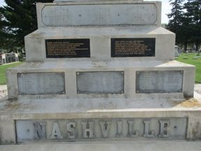 This is a 36 foot monument of white bronze (zinc) in an impressive setting at the entrance to Union Cemetery. 167 soldiers are inscribed on the four sides and there are panels of Washington, Lincoln, Grant, and a common soldier. The white bronze has had restoration efforts in the past and looks good. There is a marker indicating that funds were left in an estate to maintain the monument. Union Cemetery is on the NW side of town. From Highway 3, take 19th Street north to the cemetery. The first photo was taken 7/31/10 -the others on 9/16/19.