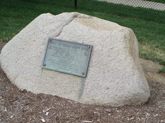 This is the site of Camp Pope, a Civil War training camp in Iowa City. The plaque was placed in 1926. Today it is in the playground area of Longfellow School. It is in the central part of the city at 1130 Seymour Avenue. Photos taken 8/3/20.