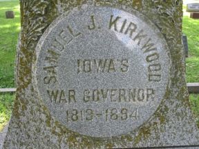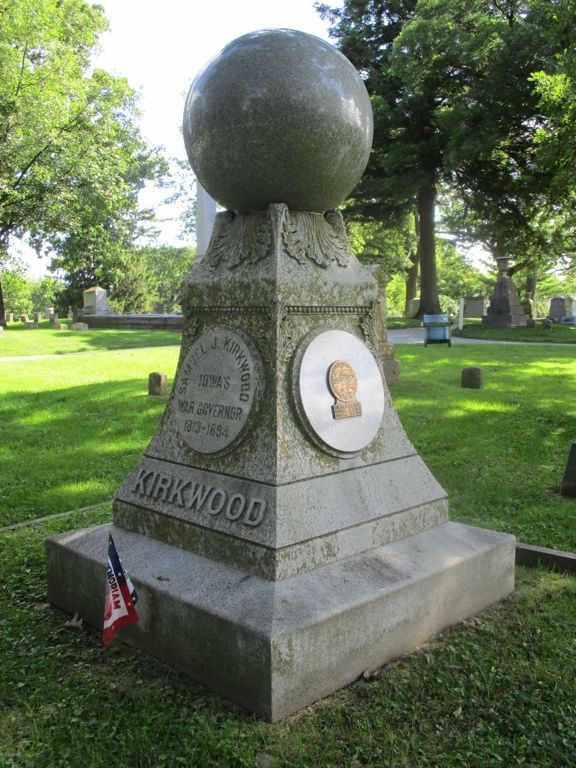 Samuel Kirkwood (1813-1894) served as Iowa's War Governor from 1860-64. He was supportive of President Lincoln's policies and was very successful in raising troops to aid the war effort. During the siege at Vicksburg, he visited the many Iowa regiments on duty there. He moved from Ohio to Coralville, Iowa in 1855. He was elected to two terms as Governor and served from 1860-64. He was elected to another term in 1876 - he resigned to become a Senator from 1877 to 1881. He also served for a brief time as Secretary of the Interior in the Garfield Administration. While not in politics, he practiced law and was a bank president. He is buried in Oakland Cemetery on the NE side of the city - turn right or east off Governor Street onto Brown Street to the cemetery. At the office, look slightly left at the top of the hill and you can see the distinctive memorial with the large granite ball. Photos taken 8/3/20. Also refer to the sculpture of him at the Vicksburg National Park.