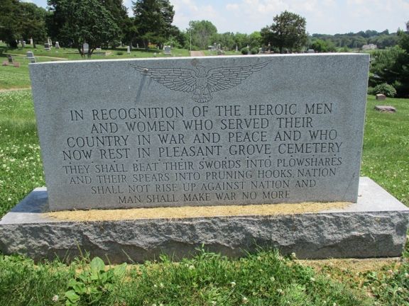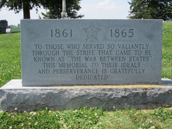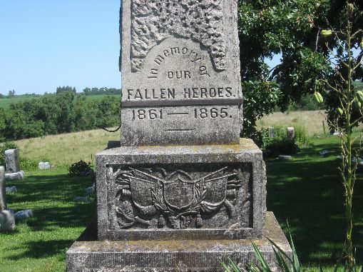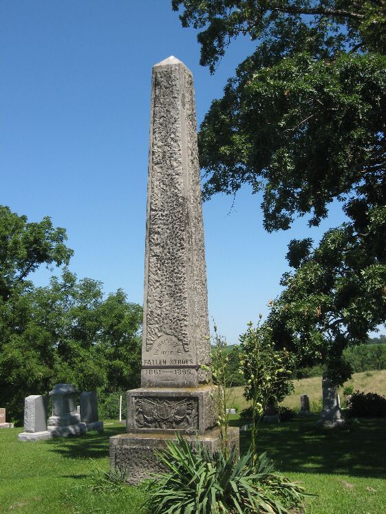 This monument is close to several CW Veteran tombstones in Pleasant Grove Cemetery (also called West Cemetery.) It is a 2 by 4 foot gray granite memorial with inscriptions on both the east and west sides. Old photos show a much larger memorial but it became dilapidated and was replaced with this one in 1983. This cemetery is on the west side of town – just north of Highway 92. It was difficult to find the monument in the cemetery – driving on the main road through the cemetery – take the next-to-last side road west to locate it. The first photo was taken 11/29/07 - the others 7/8/20.