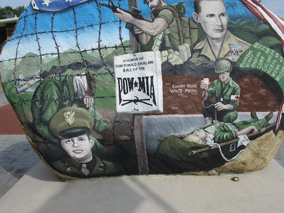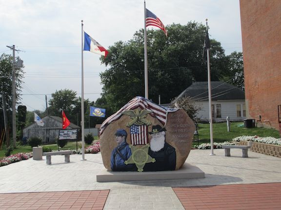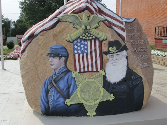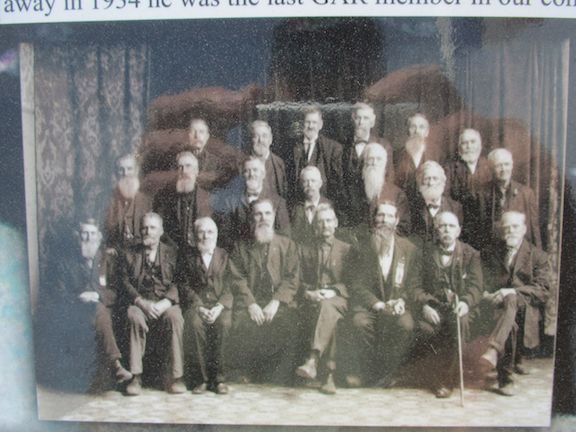 The front of the Freedom Rock is dedicated to the Grand Army of the Republic or GAR. This was a fraternal organization that many Civil War Veterans joined after the war. The painting symbolizes a man both as a young soldier and as an aged member of the GAR. The Humes GAR Post Number 144 was active from 1883 through 1925. The undated photo shows members of the Humes Post. The final photo on the west side of the Rock honors Veterans of more recent wars.The Freedom Rock is located next to the impressive Opera House in What Cheer. It was painted by Ray "Bubba" Sorensen. Photos taken 9/2/21.