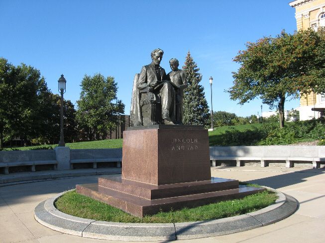 This monument is on the west side of the Iowa State Capital in Des Moines. It was dedicated in 1961 after a fund-raising drive by school children in the State. It is said to be the only statue of Lincoln depicting him in his role as a father. The statue was designed by Fred Torrey and his wife Mable Torrey. The photo was taken 9/24/07.