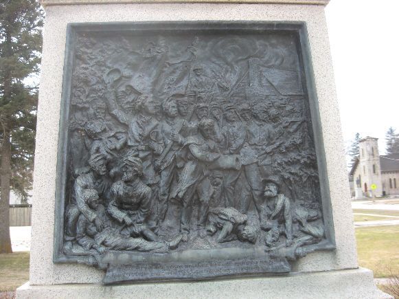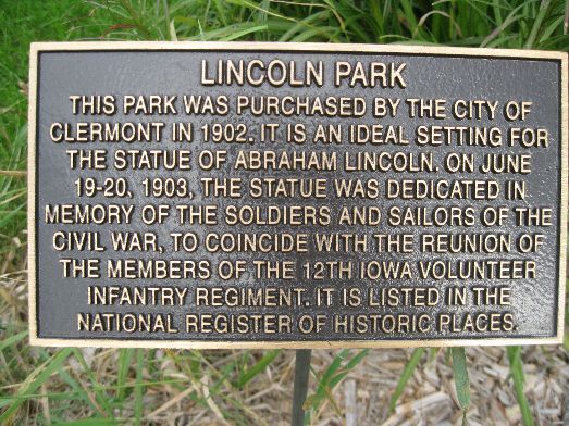 This is a striking statue of Abraham Lincoln, standing 7 feet, 6 inches, with four bas relief sculptures of Civil War scenes. The sculptor was George Bissell. The monument was a gift of Gov. Larrabee at a cost over $5000. The monument was completed in 1902 and dedicated in 1903. It is in a small park on Highway 18 just east of the business district in historic Clermont. The panels are, on the east, "Leaving for War"; on the north, a scene from Shiloh; on the south, a scene from Mobile Bay with Admiral Farragut; and on the west, a scene from Appomattox. The first two had images of local soldiers. Thanks to Jeanenne Cullop for sending a copy of the 12/3/1902 Hartley Herald with historic information about this monument. Photos taken 3/25/08.