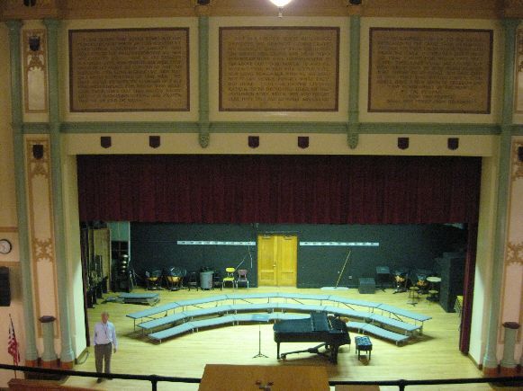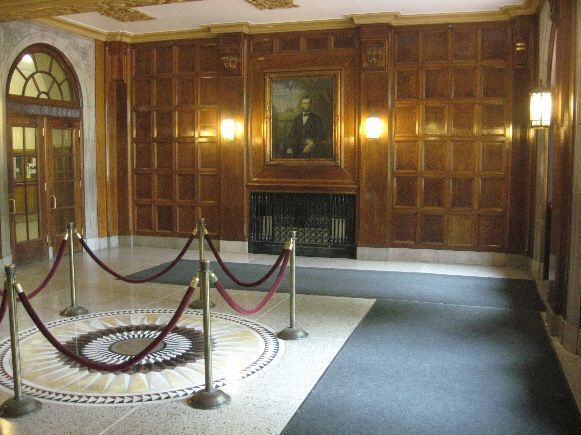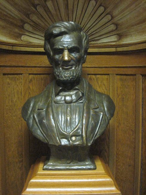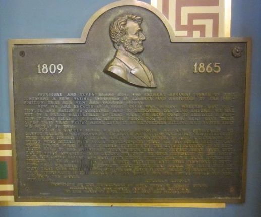 Abraham Lincoln High School has several memorials to Lincoln. There is a bust of Lincoln in the main hallway with shiny nose. It is considered good luck to rub his nose when passing by. The main entrance has two paintings of Lincoln by Russell Cowles dated 1923 - one as a young man. There is also a bronze plaque of the Gettysburg Updateress in the hallway and marble tablets of the Gettysburg Updateress over the stage in the auditorium. There are many interesting architectural features of the building which was opened in 1923. Veterans who attended Lincoln HS are also recognized - a plaque lists the names of 67 that "gave the surpreme sacrifice" in WWII. The High School is in the south part of Des Moines. It is off SW 9th. Photos taken May 13, 2008.