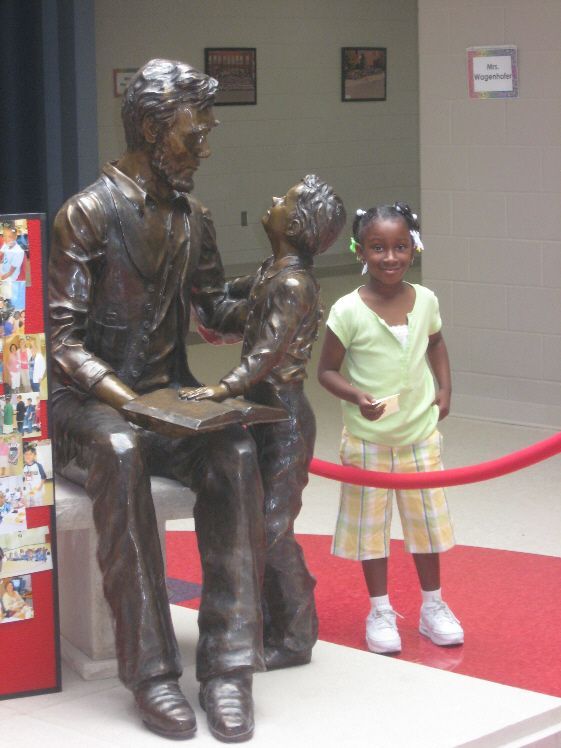 Lincoln Elementary School was opened in 2004. In the front lobby under a skylight (along with a 1st grader) is an impressive bronze statue of Lincoln and Tad modeled after the statue at the State Capital in Des Moines. The sculptor is John Jago, a Waterloo native. The school is in the NW part of town at 302 Cedar Bend Street. Photos taken 8/29/08.