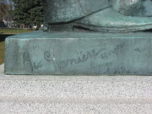 This is an impressive statue of Abraham Lincoln at Webster City High School. The bronze statue is about 7 feet high. The sculptor was George E. Ganiere. It was dedicated in 1913. It is located on the west side of town at Bank and Lynx Streets. Take Bank Street west to the High School. Photos taken 10/28/08.