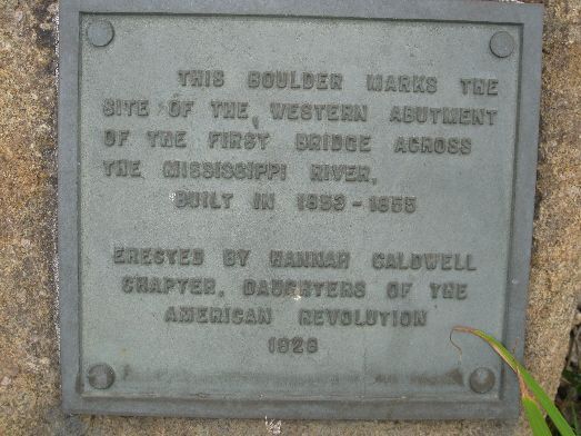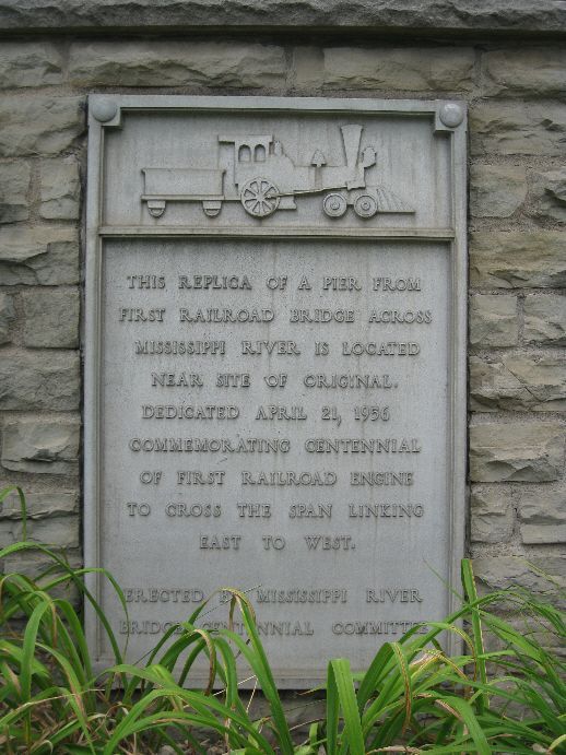 This monument marks the western abutment of the first bridge across the Mississippi which was built in 1856. Two weeks after completion, the steamboat Effie Afton hit the bridge, caught fire and burned to the water line. The steamship companies sued the railroad but defended by Abraham Lincoln, the railroad prevailed, and the bridge remained open. Besides the significance of Lincoln's involvement, this was very important to Iowa's development in opening commerce to the east. The original bridge no longer exists - it is near today's Government Bridge which connects to Arsenal Island. It is along the north side (or side away from the River) of River Drive at the intersection of East Forth Street. The DAR plaque was dedicated in 1928 and the large monument was dedicated in 1956. Photos taken 6/30/09.