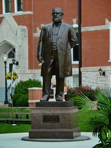 James Harlan represented Iowa in the Senate intermittently from 1855 to 1873. He was a strong supporter of Abraham Lincoln and was appointed Secretary of Interior shortly before Lincoln’s death in 1865. Daughter Mary Harlan married Robert Todd Lincoln and they and their children made many trips to Mt. Pleasant. The house was built in 1876 and served as a retirement home for James Harlan. Also shown is a statue of Senator Harlan. Follow Main Street north of the business district to the house. Photos were taken 9/1/20. The photo of the statue was taken by Jo Porter on 5/11/19.