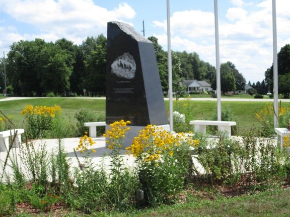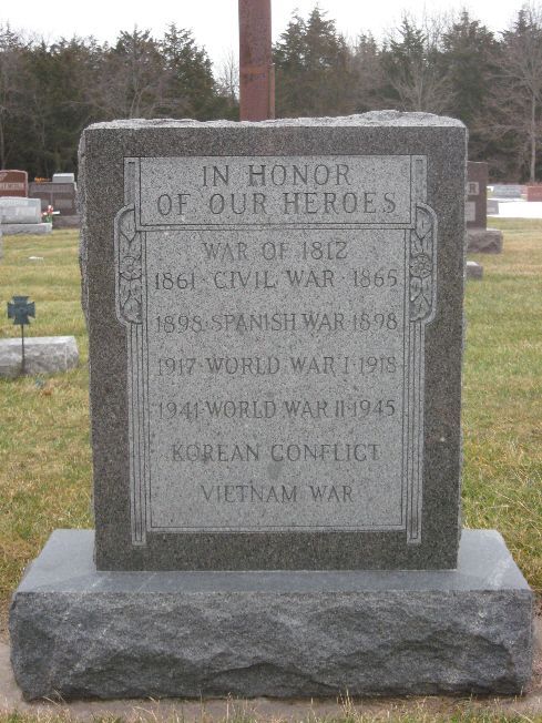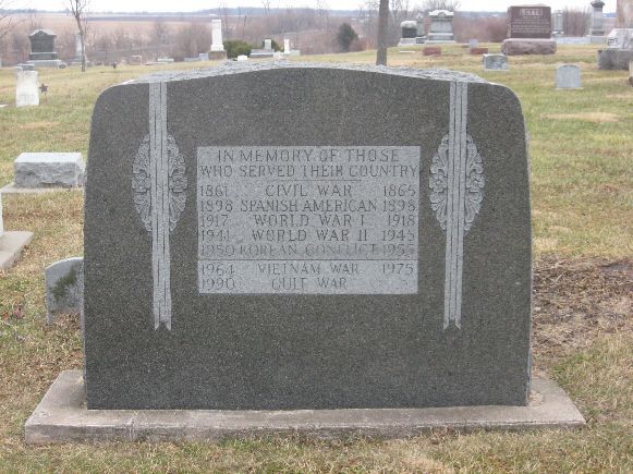 This monument honors Veterans from a number of Wars. It is in the Cemetery about one half mile east of town. It is granite about 3½ feet high and 2½ feet wide. The monument is located by the flagpole and across the road from the shed. The Photo was taken 11/26/08.