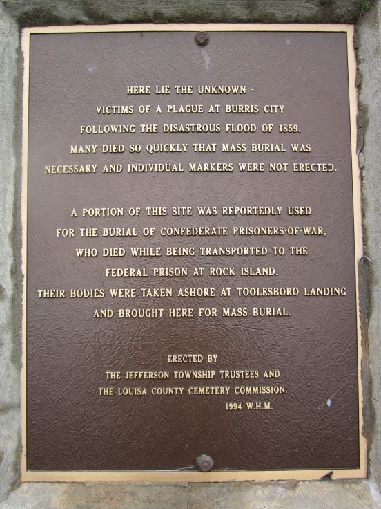 This plaque recognizes those buried here in unmarked graves from the town of Burris City (which no longer exists) and Confederate soldiers who are said to have died while being transported to prison at Rock Island. Burris City, at the confluence of the Iowa and Mississippi Rivers, was flooded in 1858 and many residents died during cholera or yellow fever epidemics. Mallory Cemetery is a beauitiful little cemetery about 9 miles southeast of Wapello on County Road 99. Thank you to Steve Hanken for notification of this monument. Photos taken 5/28/11.