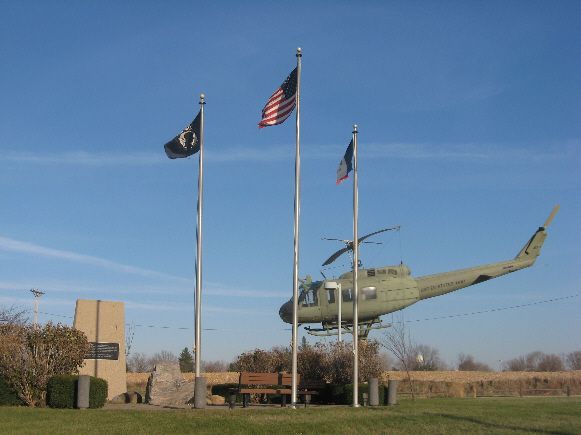 There is an impressive Veterans memorial at the entrance to Grandview. It was dedicated July 4, 1991 led by the Louisa County Vietnam Veterans. It includes a Freedom Rock painted by artist Ray "Bubba" Sorensen. The west side of the Rock is dedicated to William Reddick. He was one of the Andrews' Raiders - this was also called the Great Locomotive Chase. Reddick was captured by the Confederates but later released in a prisoner exchange. He was one of the first recipients of the Medal of Honor. He was a member of the Ohio 33rd Infantry, but settled in this region after the War and is buried in the Letts Cemetery only a few miles away. Please see more information listed under Letts in Louisa County. This memorial is located at the intersection of Highways 61 and 92. The photo of the Rock was taken 8/12/20. The photo of the helicopter and flags was taken 1/9/08.