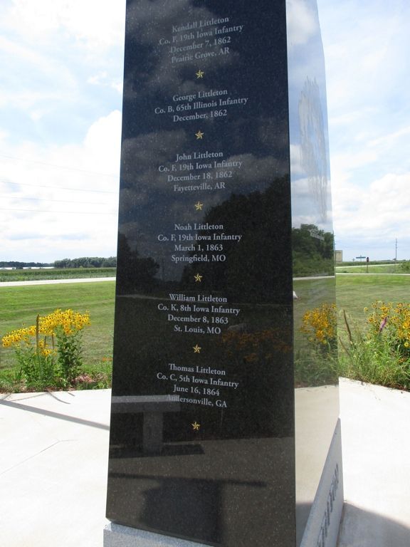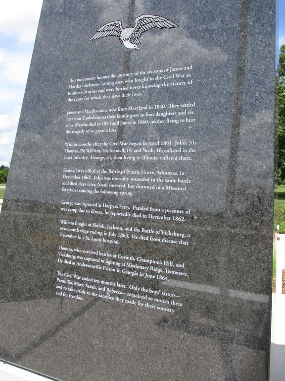 This impressive monument was dedicated June 14, 2016 to the memory of the six Littleton Brothers who lost their lives in the Civil War. They perished due to death in battle, illness, accident and as prisoner of war. The monument is black granite and about 11 feet in height. The front has an etching representing the brothers, Thomas, William, George, John, Kendall and Noah. The back side has a history of the brothers and their family. The left side lists the brothers and their regiments. Thanks to Tom Woodruff and Ed Bayne for uncovering this amazing story of the brothers and leading the effort to recognize them with this monument. It is located on Highway 99 at the entrance to the Toolesboro Indian Monument Historical Site, just outside the small town of Toolesboro. Photos taken 6/14/16, 6/25/16 and 8/12/20.