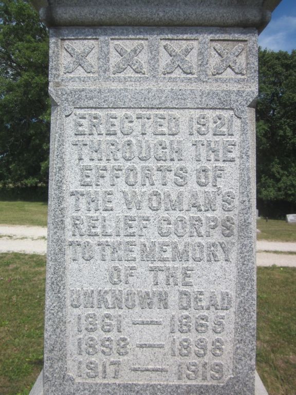 This is an 8 foot granite monument with an eagle on top. It was dedicated by the WRC in 1921 to veterans of all wars. The east face of the monument lists soldiers killed in World War I. The west side of the monument honors unknown soldiers including those from the Civil War. This is a country cemetery west of East Peru on road G68 in SE Warren County. Photos taken 6/27/17.