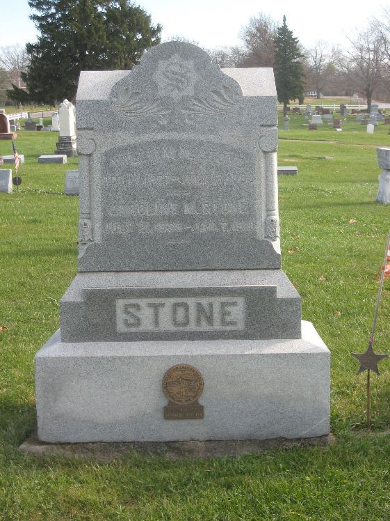 William M. Stone (1827-1893) was the Colonel and commanding officer of the Iowa 22nd Infantry Regiment. His regiment led the Federal charge at Vicksburg on May 22, 1863 and were the only Federal troops to actually occupy Confederate positions for a period until being driven back. Col. Stone was wounded in this battle. After resigning from the Army, he ran and was elected as Governor of Iowa for the 1864-68 term. He was at Ford's Theater the night President Lincoln was shot and helped carry the wounded body across the street. He had a law practice in Knoxville after serving as Governor. This unpretentious memorial, considering he was a former Governor, is in Graceland Cemetery in Knoxville. The inscription is difficult to read. Other family members are buried near-by. As you enter the cemetery, bear right and after rounding a curve in the road, the gravestone is on the left. Take Pleasant Street west to the west edge of town - it is near the Veterans Hospital. The first two photos were taken 11/18/08.