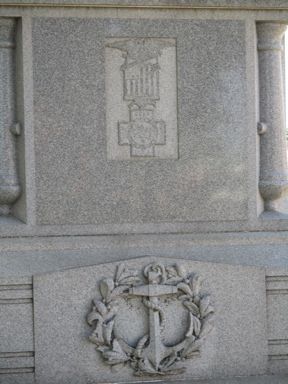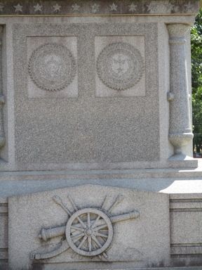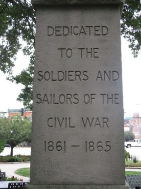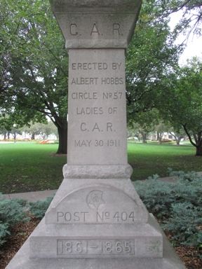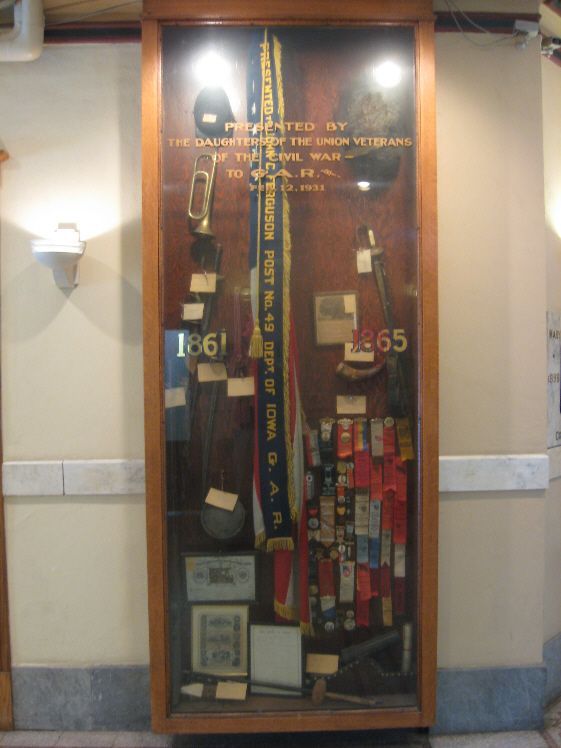 This monument has a statue of a Civil War soldier but is "Erected to the memory of the soldiers, sailors and marines of all wars." It was dedicated November 11, 1920. It is an attractive granite monument about 25 feet high on the NW corner of the courthouse square in Knoxville. Just southeast of the Monument is the Peace Tree plaque. This is dedicated to the spot under a tree where 40 soldiers enlisted on February 4, 1863. The original tree, of course, is gone but a replacement tree is located here and shows up behind the Monument in the photo. In the courthouse is a case of CW artifacts including swords, a sash, canteen, bugle, powder horn and GAR ballot box. It includes a large collection of GAR ribbons from Captain Charles Wells of the 8th Iowa. Photos taken 8/6/10 of the monument and plaque and 11/18/08 of the case in the courthouse. The 4 photos of the sides of the monument were taken 8/9/18.