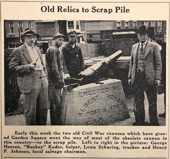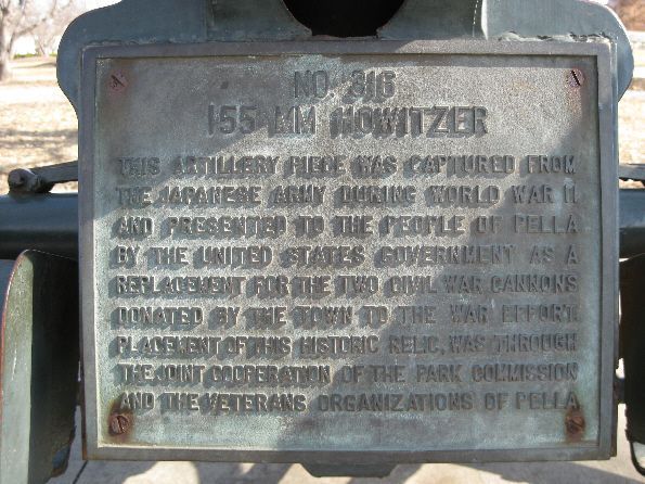 This is a very attractive 18 foot monument in the SE corner of Pella’s town square, erected in 1911. The statue is said to represent Captain Albert Hobbs of Pella who was killed at Shiloh on April 6, 1862. The GAR post was named Albert Hobbs Post #404. A 155mm Japanese howitzer Type 4 is near-by. I formerly lived in Pella and remember well playing on this cannon as I was growing up. Monument photo taken 9/29/07 and cannon photos taken 5/10/09. The close-up photos were taken 9/25/18. In 1912, two Civil War cannons were placed by the monument. These were scrapped for metal for World War II in 1942. The Japanese cannon was received in 1948 - see final two old photos. Thanks to the Pella Historical Trust for information.