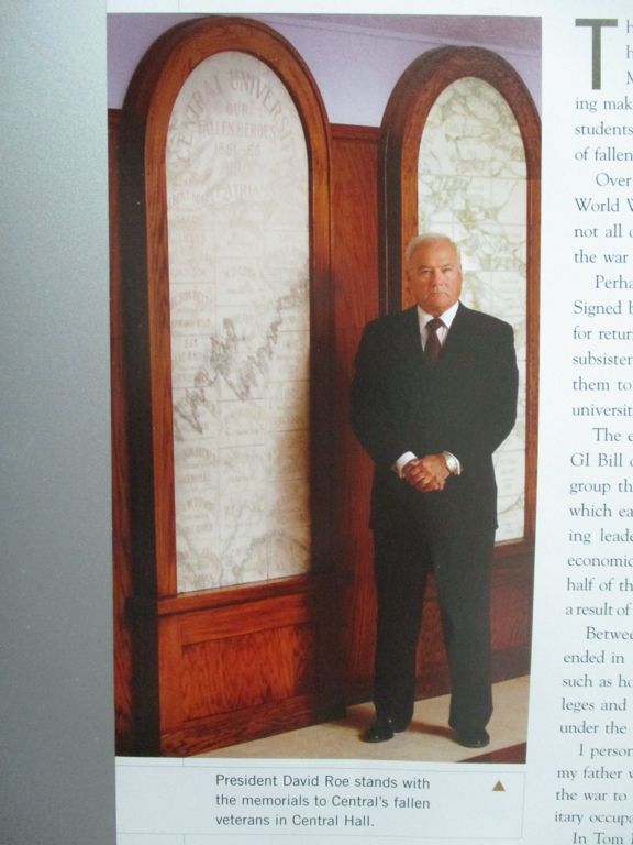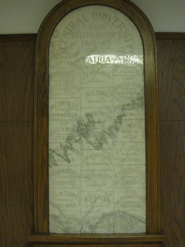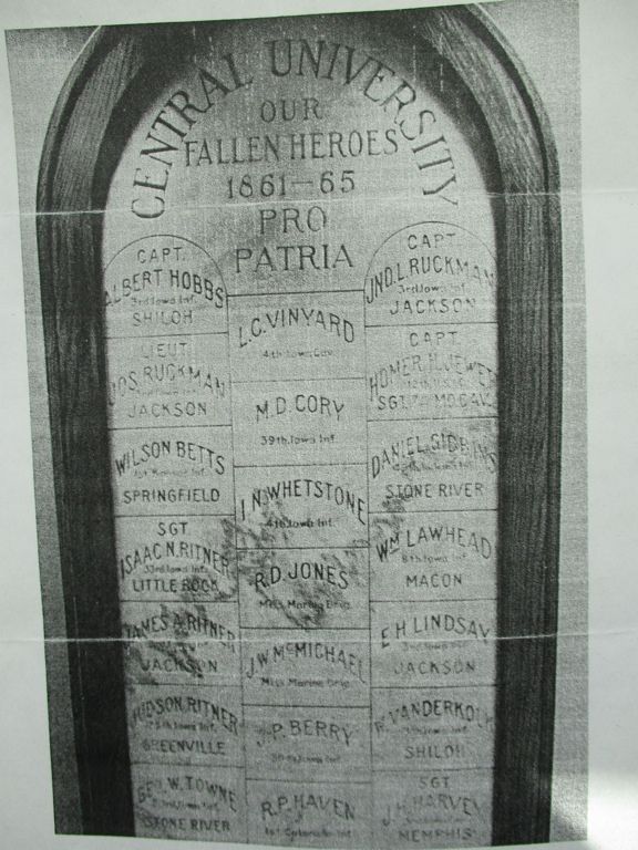 When the war broke out in 1861, many male students left college and joined the army. This marble memorial honors the students killed in the war. Four of these students were members of the 3rd Iowa Infantry Regiment and fell at Jackson, Mississippi on July 12, 1863. This memorial is currently in storage on the Central College campus in Pella - there are plans to display it in the future. The original memorial was installed shortly after the war but was destroyed in a fire in 1922. This replacement is identical to the original. The first photo was taken 12/20/10 - the second undated photo shows the names more clearly - the final photo is of College President David Roe in 2006 with the similar Civil War and WWII Memorials.