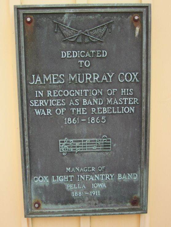 J. M. Cox (1845-1925) enlisted as a drummer in Co. G of the 17th Iowa Infantry in l862 at the age of 16. He was taken prisoner and paroled on December 20, 1862 at Holly Springs, Mississippi. He re-enlisted in the same regiment in 1864 and was promoted to Principal Musician and was the leader of the regiment's band. He again was captured at Tilton, Georgia on October 13, 1864 and sent to Andersonville Prison where he remained for over 7 months until the war was over. The band, captured intact, often played in prison. Known as Murray Cox or "Captain" Cox, he returned to Pella after the War and was a leader of town bands for many years. He was active in the GAR and a prominent town citizen. On September 28, 1922, a new bandstand in Central Park was dedicated in his honor. It is believed the plaque was also dedicated and placed on the bandstand at this time. In recent years, the bandstand was taken down and the plaque was moved to the Pella Historical Village at Franklin and E 1st Street on the east edge of the Pella business district. Photo taken 9/1/11.