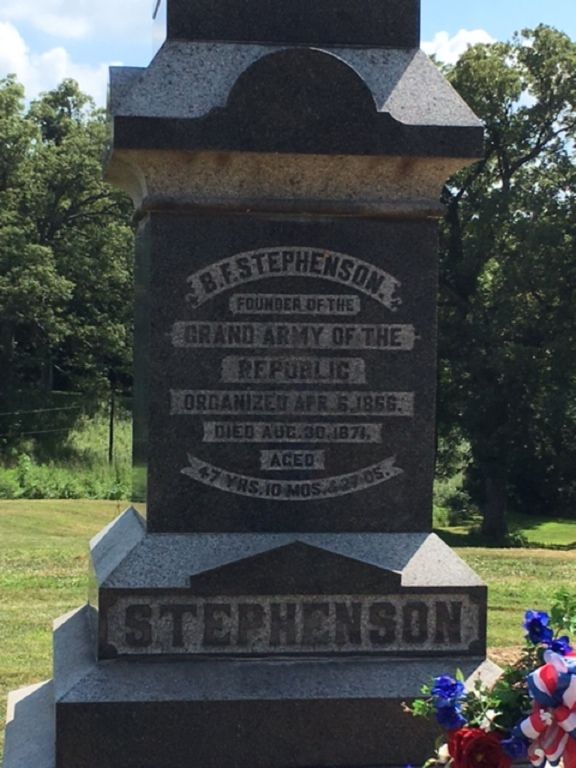 On August 11, 2016 there was a memorial service to honor Dr. Stephenson at his gravesite in Petersburg, Illinois. 2016 is the 150th Anniversary of the founding of the GAR. Members of the SUVCW, holding their National Encampment at nearby Springfield, conducted the memorial service. The third and fourth photos were taken at this ceremony. The gravesite is located in Rosehill Cemetery on the east side of Petersburg.