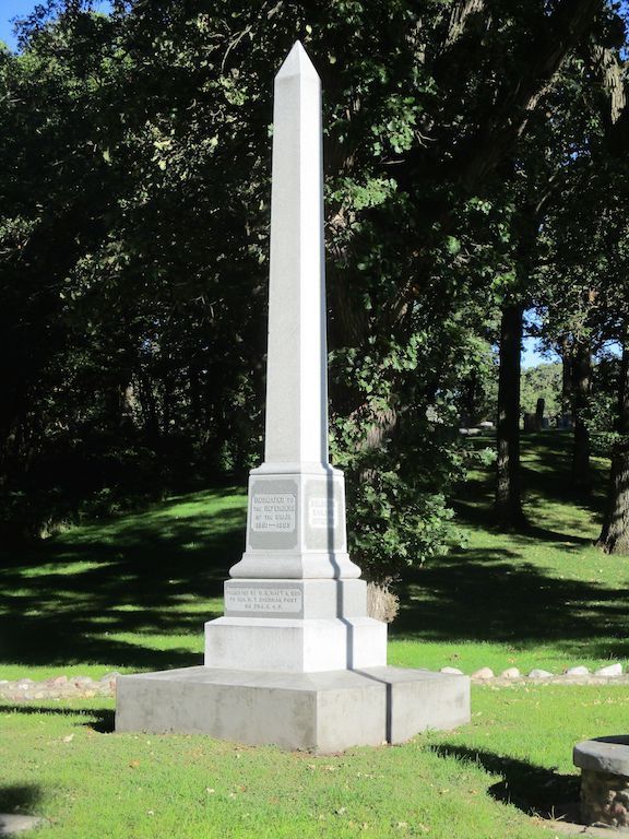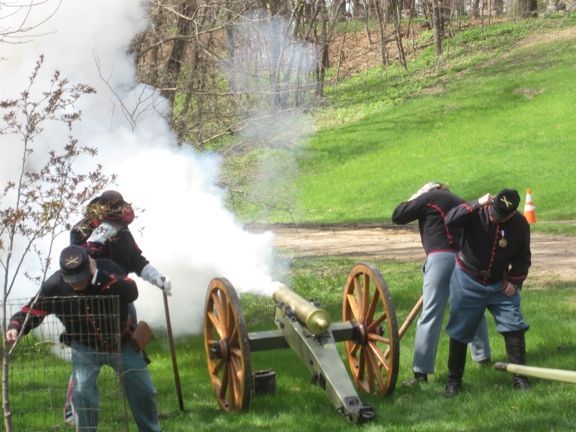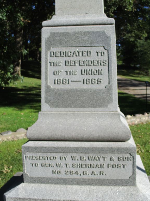 This memorial is in Oakland Cemetery in the north section of Sac City. It is an 18 foot obelisk dedicated in 1906. Besides the inscription shown on the south side of the monument in the photo - the east side says ""Soldiers Sailors Citizens" - north side "May the Remembrance of their Valor and Patriotism be Perpetuated" "presented September 1, 1906" - west side "General W T Sherman Post No 284." Go north on 5th Street - after crossing the river, turn left at the 3rd cemetery entrance - then bear right or NW and drive a distance until you come to the monument. The first 2 photos were taken 9/22/21. The final photos were taken 5/4/14 at a monument re-dedication ceremony led by members of the Kinsman SUVCW Camp. This includes a cannon salute by the 2nd Battery Iowa Light Artillery of Sac City.