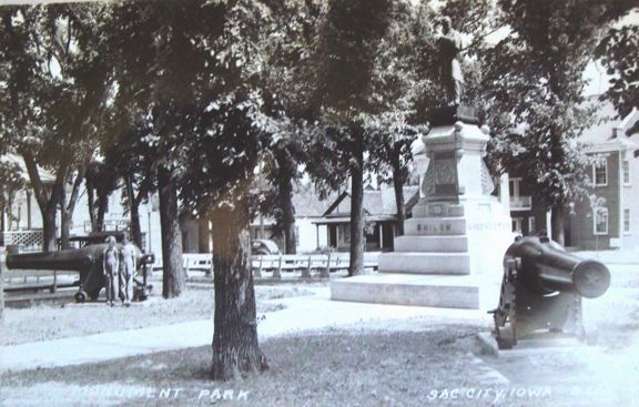 This is a bronze soldier with a granite base. The height is 20 feet. It is in a nice setting in Monumental Square, a small city park just across the street from the Courthouse. There are 20 names of soldiers from Sac County inscribed on three sides of the monument - one of these is shown below. It was built at a cost of $3472 and dedicated November 21, 1894. There are four 105mm Howitzers M3A around the monument - these are WWII cannons. Originally there were CW cannons - see the old postcard. They no doubt were scrapped during WWII and later replaced with the WWII howitzers. It is located just east of the business district on Highway 20. Also see the separate listing for the GAR Hall just west of the monument. Photos of the monument were taken 9/22/21 - photos of the howitzers were taken 2/24/09. Thank you to Danny Krock and David Shedlock for providing copies of the old undated postcards.