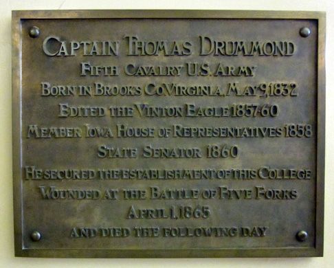 Captain Drummond (1832-1865) moved from Ohio to Iowa in 1855 and became editor of the "Vinton Eagle". He was also a member of the Iowa Legislature and was responsible for legislation establishing the Iowa School for the Blind in Vinton. He served in the 2nd U.S. Cavalry, the 4th Iowa Cavalry, and the 5th U. S. Cavalry. He died April 2, 1865 of wounds received in the Battle of Five Forks, Virginia. He also fought in other major battles in the East.