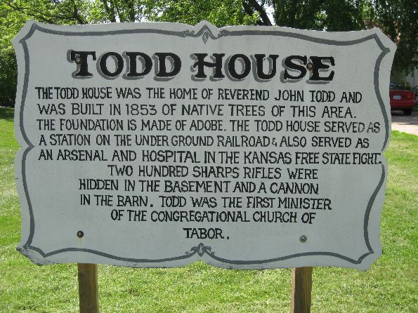 The John Todd House, in SW Iowa, was an important stop on the underground railroad. John Brown came through this area many times. John Todd was a Congregational minister and served as a Chaplain in the 46th Iowa Infantry Regiment in 1864. The house is located on the west side of town on Park Street and on the west side of City Park. The home is open to the public by appointment - call 712 629-3164 for information. Photos taken 5/16/09.