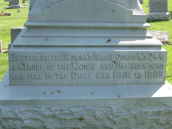 This unusual “white bronze” or zinc monument is about 6 feet plus the height of the rifles. It was erected by the WRC and local citizens in 1903 and dedicated to unknown soldiers. Rose Hill Cemetery is on the west side of Grundy Center on Highway 175. There are three cemeteries together at the same location - Rose Hill, Fairview and Sacred Heart. The monument is on the northern edge of the cemetery. Photos taken 8/21/10.