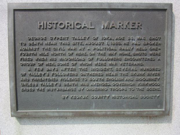 On August 1, 1863, there was a meeting of the Peace Democrats, called Copperheads, on the outskirts of South English. After the meeting, many drove wagons through town where they were confronted by Union supporters. Both sides were armed and shots were fired. Rev. George Talley, the leader of the Peace Democrats, was shot and killed. It was unclear who fired the first shot and who fired the shot that killed Talley. It was said that hundreds of Peace Democrats begin gathering to avenge Talley's death. Iowa Gov. Kirkwood led troops here and the situation eventually calmed down without further violence. This was called the Talley War or Skunk River War and received much publicity throughout the country.