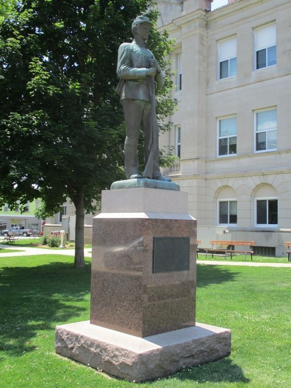 This is an attractive monument with a 7 foot base of red St. Cloud granite and a 6 foot bronze soldier. According to a newspaper account, it was to be dedicated on July 4, 1929, with a grand celebration including a parade, bands, speeches and the attendance of 13 CW vets. There was a problem – the bronze soldier did not arrive on time. Apparently the celebration went on as scheduled and the soldier had to be attached at a later date. There is a small inscription on the statue indicating it was manufactured by the American Art Bronze Foundry in Chicago. The monument is in the Courthouse Square in Sigourney. Photos taken 7/8/20.