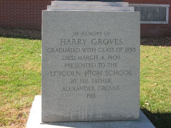 Abraham Lincoln High School has several memorials to Lincoln. There is a bust of Lincoln in the main hallway with shiny nose. It is considered good luck to rub his nose when passing by. The main entrance has two paintings of Lincoln by Russell Cowles dated 1923 - one as a young man. There is also a bronze plaque of the Gettysburg Updateress in the hallway and marble tablets of the Gettysburg Updateress over the stage in the auditorium. There are many interesting architectural features of the building which was opened in 1923. Veterans who attended Lincoln HS are also recognized - a plaque lists the names of 67 that "gave the surpreme sacrifice" in WWII. The High School is in the south part of Des Moines. It is off SW 9th. Photos taken May 13, 2008.