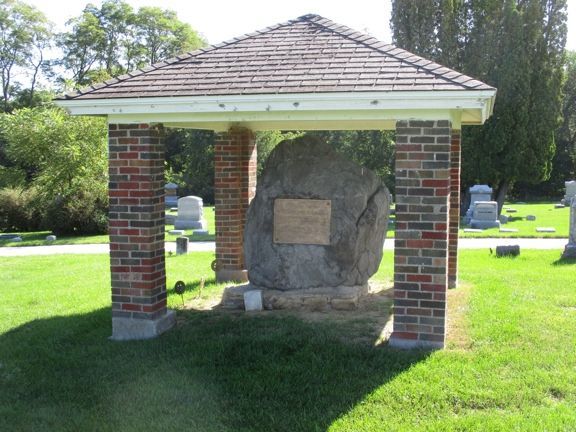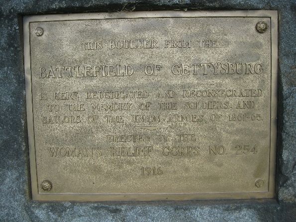 This is an actual boulder brought from Gettysburg. It is granite about 5 1/2 feet high, 4 1/2 feet wide and 3 feet deep. There is a plaque showing it was dedicated by the WRC in 1916. Originally there were four mountain howitzers on the corners of the monument but they are now located at the Lisbon History Center. The cemetery is in the SE part of town. Take Washington Street to Cemetery Road - then Gettysburg Drive to the monument. Photos taken 8/23/19. There is also an old photo of the dedication.
