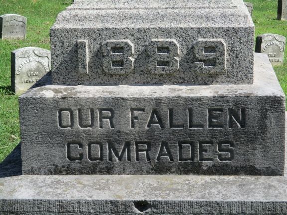 This memorial is a 15 foot granite obelisk in a Civil War section of the cemetery. The only inscriptions are "1889" and "Our Fallen Comrades." There are 43 CW Veteran headstones near the monument. Take the entrance at Mt. Vernon Road and 15th Street SE. To find the monument, bear left at the entrance and it will be left of the road. Photos taken 8/23/19.