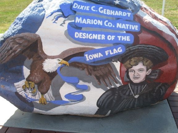 Artist Ray "Bubba" Sorensen painted a Freedom Rock that honors William Stone and Dixie Gebhardt, a Marion County native and designer of the Iowa Flag. It is located on 526 N. Lincoln Street in Knoxville just south of the Race Track. These photos taken 8/21/20.
