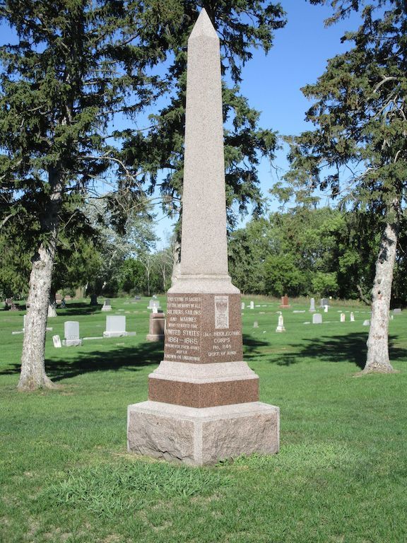 This attractive monument is at the Riverside Cemetery located about one mile north of town. Thanks to Steve Hanken for the notification of this monument. Thanks also to Dennis Hultgren for his excellent description of this monument,"It is a very nice obelisk, quite tall, slender, 4 sides, and coming to a point at the top. It is made of red granite. it is surrounded by 4 very old pine trees. I imagine those trees were planted at the same time as the dedication of the monument in 1910. This is almost in the center of the Cemetery, on a high location at the conjunction of cemetery roads. There are at least 12 Civil War Veterans buried in the cemetery. Most are buried near the Monument." He points out that all veterans would be immigrants to the area as Akron did not exist at the time of the war and is across the Missouri River from South Dakota. The inscription on the south side is "This stone is sacred to the memory of all soldiers, sailors, and marines who served the United States 1861-1865 wherever their ashes may lie known or unknown." The north side reads "erected A. D. 1910 by the Grand Army of the Republic, Womens Relief Corps and Citizens." The GAR inscription on the front is "Jas. Biddlecome Post No. 461." The WRC inscription on the east side is "Jas. Biddlecome Corps No. 245." Photos taken 9/23/21.