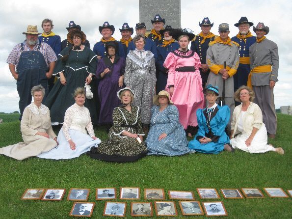 This large impressive monument is in Brooklyn Memorial Cemetery (also known as the IOOF Cemetery). It is granite and about 35 feet high. There are panels with quotations on each side. It was dedicated in 1882. The cemetery is on the east side of town. Take Des Moines Street east to the cemetery. The monument is in the SE portion of the cemetery. The first photo and the photo of the panel were taken 11/8/07. The third photo is undated and furnished by Danny Krock. The final photo was taken in front of the monument on 6/12/10 - it includes members of the Historical Society who gave tours of the cemetery and dressed up for the occasion.