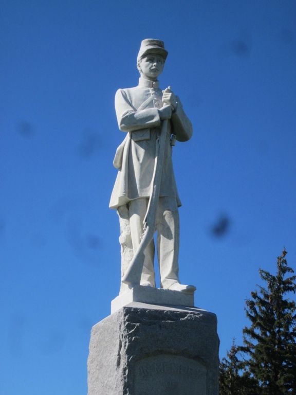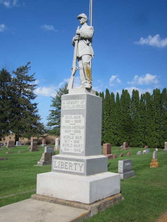 This is a nicely kept up country cemetery north of Grinnell. The monument is about 13 feet high with a granite base and soldier made of marble. The face and build makes the soldier look very young. The inscription reads "In memory of our Fallen Heroes 1861-1865." Take Highway 146 north of Grinnell – turn east on 320 Avenue – then turn north on 35th street for about 1/2 mile to the cemetery. The first photo was taken 7/26/10 - the second one on 10/8/17.